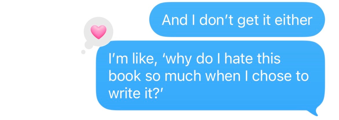 But the only thing worse than writing the new draft was editing it. I spent a week and a half combing through bloated, boring scenes before I really started to panic. I vowed to take a break from writing novels after this one was published – ‘It’s too much work!’ – but then again, I just couldn’t see it going ahead. ‘Maybe they won’t even want it?’ I said to another author, my voice dripping with hope. She assured me it’d have to be markedly worse than the last draft for them to pull the pin, and even then – they’d already given me the money. Surely that meant they were serious about it.